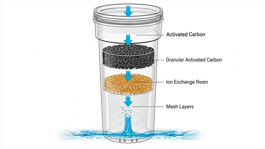 Before reaching the core filtration materials, water passes through a fine mesh that captures larger particles like sediment and rust. This pre-filtration stage helps protect the carbon and resin layers, extending the life and performance of the filter.